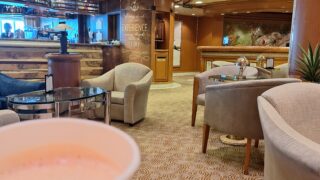ダイヤモンドプリンセス乗船2日目 私の一日は 仕事のためお留守番している主人を起こすためのモーニングコールから始まります カフェラテ癒しのひととき 朝6時半ごろなのでほぼ誰もいません 5階にあるグッドスプリッツでカフェラテを頼んでLINE電...