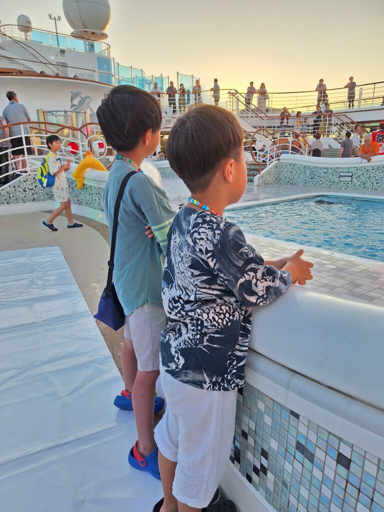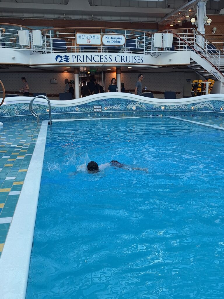 長崎は出国手続きがあるため 11時過ぎに長崎観光に出掛け 出国手続きをしてから船内に戻ってこようと言うことになり 11時頃下船することにしました 下の息子がプールで遊びたいと言うので 朝食も兼ねて14階へ行きました みんな観光下船するのか朝の時間はプール貸し切りでした♥