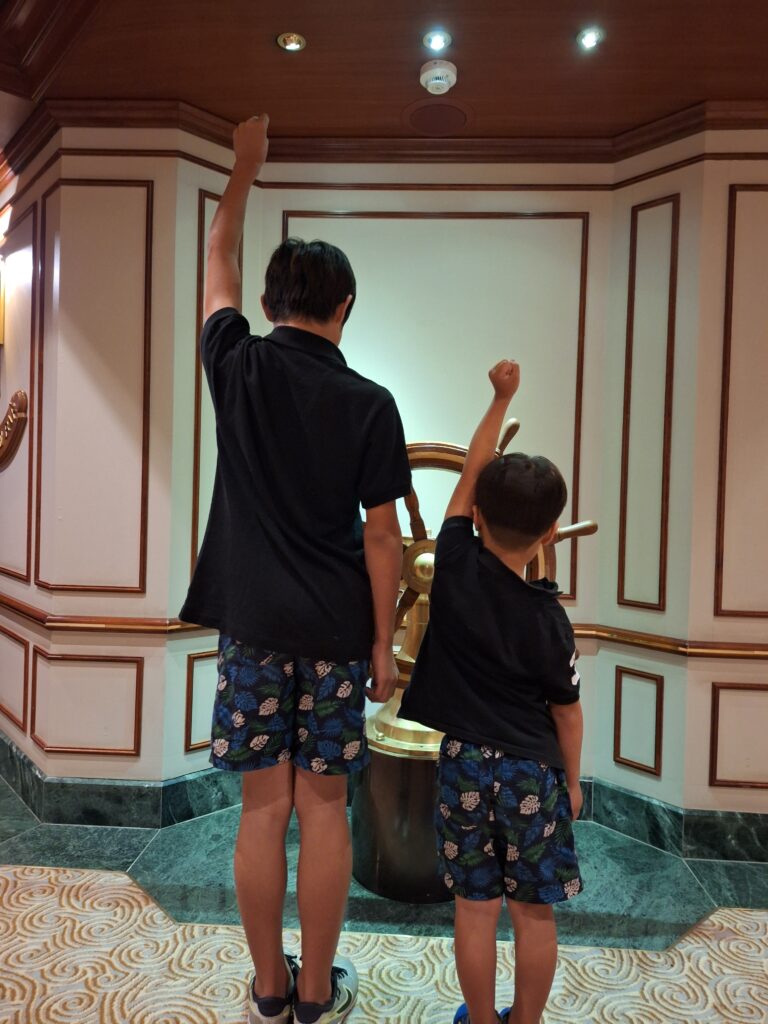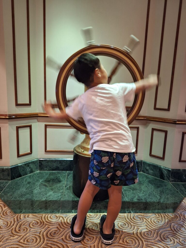 7階にある舵輪で遊ぶ下の息子 実際にくるくる回せて船長になった気分を味わえます(笑)