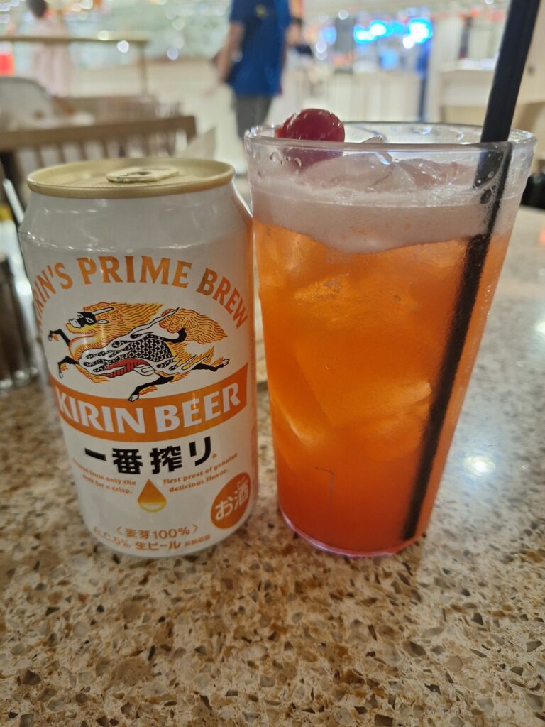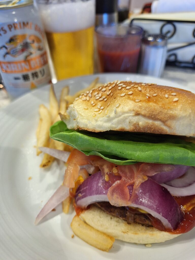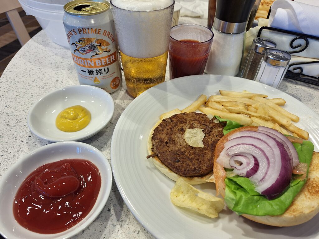 お腹も空いてきたのでランチです ハンバーガー🍔一番搾り🍺 ダイヤモンド・プリンセスのハンバーガーは本当に美味しい 14階のトライデントグリルはいつも混んでいるので 携帯でオーダーしています